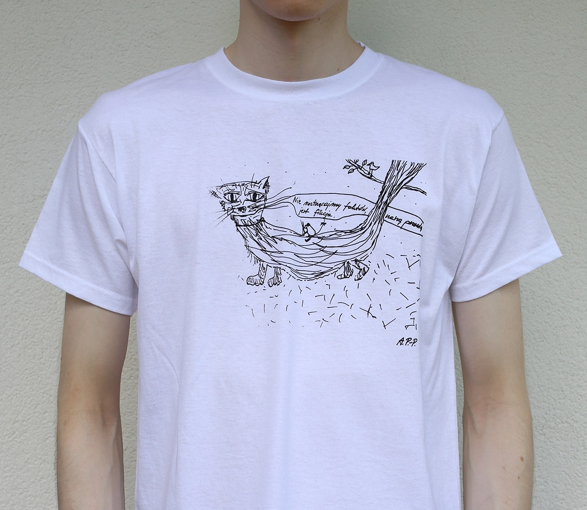 T-shirty z moimi rysunkami przywołują scenki z cyklu Mysz i Kot w sytuacjach domowych. Rysunki te ukazują niezwykłe wymiary psychiczne wzajemnego związku tytułowych postaci, skrajnie niedobranej, ale nierozłącznej pary. Znamionująca Kota skłonność do zamykania się w sferze własnych myśli, połączona z jego niepohamowanym łakomstwem, uzupełnia się z upodobaniem do monologowania i codzienną krzątaniną Myszy.