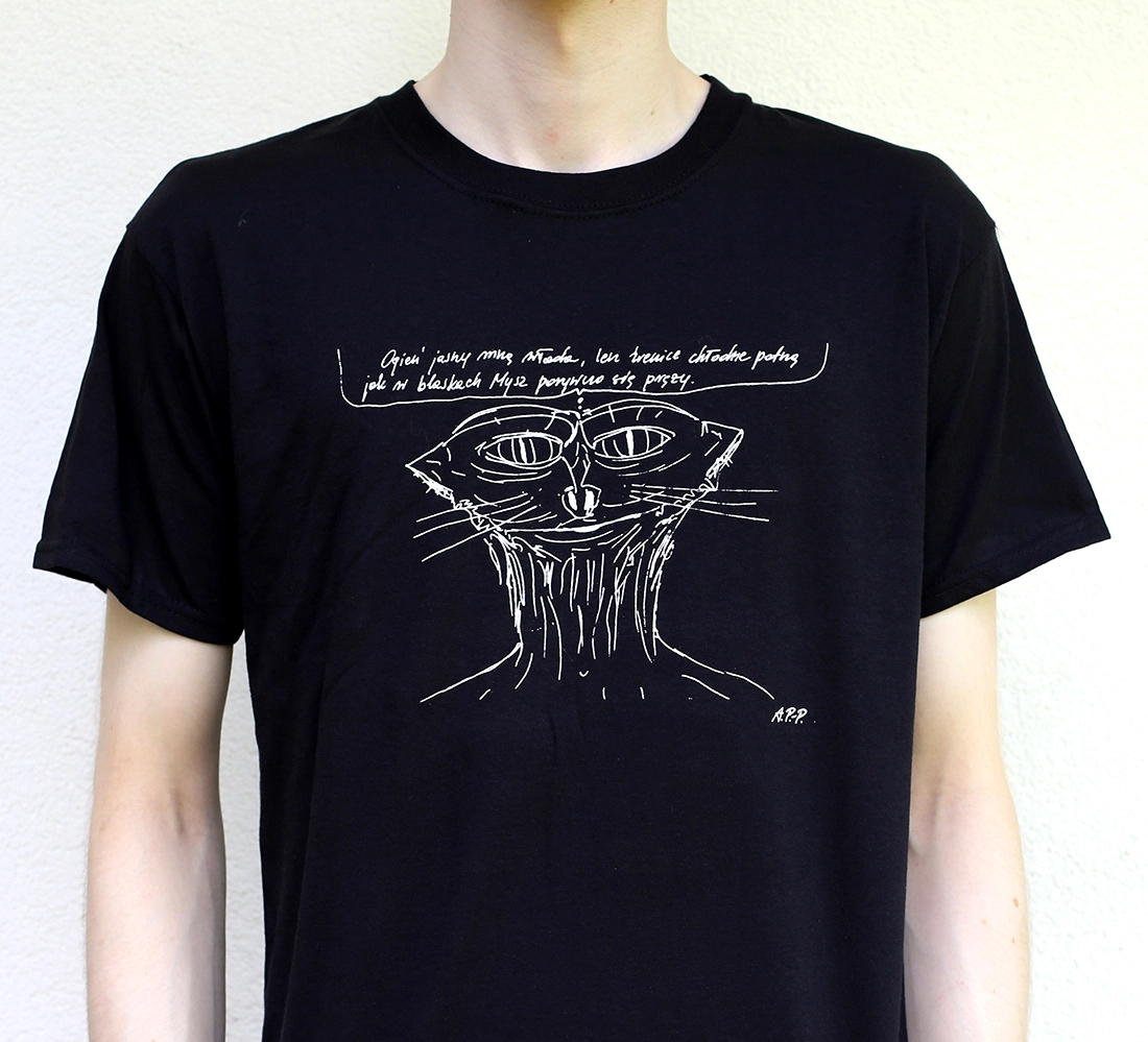 T-shirty z moimi rysunkami przywołują scenki z cyklu Mysz i Kot w sytuacjach domowych. Rysunki te ukazują niezwykłe wymiary psychiczne wzajemnego związku tytułowych postaci, skrajnie niedobranej, ale nierozłącznej pary. Znamionująca Kota skłonność do zamykania się w sferze własnych myśli, połączona z jego niepohamowanym łakomstwem, uzupełnia się z upodobaniem do monologowania i codzienną krzątaniną Myszy.