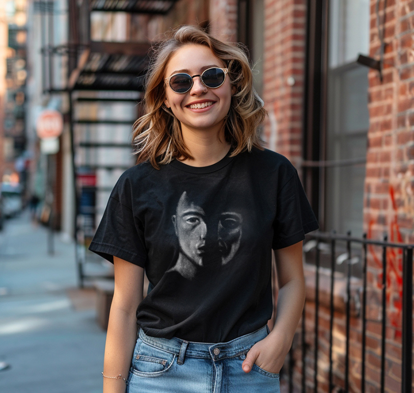 Artystyczna koszulka z nadrukiem techniką sitodruku. Jest to najtrwalsza technika nadruku.